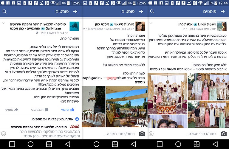 "יא אללה שלך אוסי...איך את עושה את זה?? תודה תודה תודה על החינה הכי הכי בעולם!!! אנחנו רק מקבלים מחמאות כל היום מאנשים שאומרים שהם ב ח י י ם לא ראו כזה דבר!!! הטקס היה מרגש, לא רק לנו המשפחה, גם לכל האורחים שהיו שם. לא יכלנו לבקש יותר טוב מזה!! שנחזיר לך בשמחות. אוהבת אותך מלאנתלפים :*" ציטוט נוסף מדף הפייסבוק של סוליקה תלבושות חינה והפקת אירועים אותנטיים...